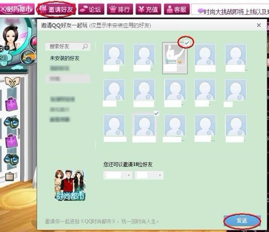 点击游戏界面上方的“邀请好友”按钮,打开好友界面(此界面仅显示未安装游戏应该的好友)。点击好友头像即可进行选择, 点击“发送”即可。