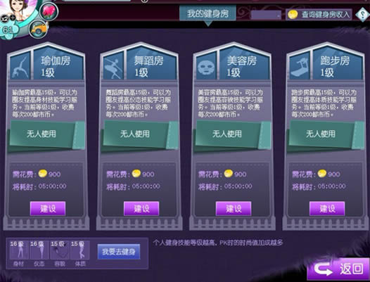 同时,到圈友健身房健身时是根据自己的健身房建设等级来缴纳不一样的健身费用,差1级增加0.5倍或者降低10%,最高相差5级以上需要缴纳增加2.5倍或者降低50%的都市币!投资健身房的收益增加,不仅仅再是为人民服务的投资了!